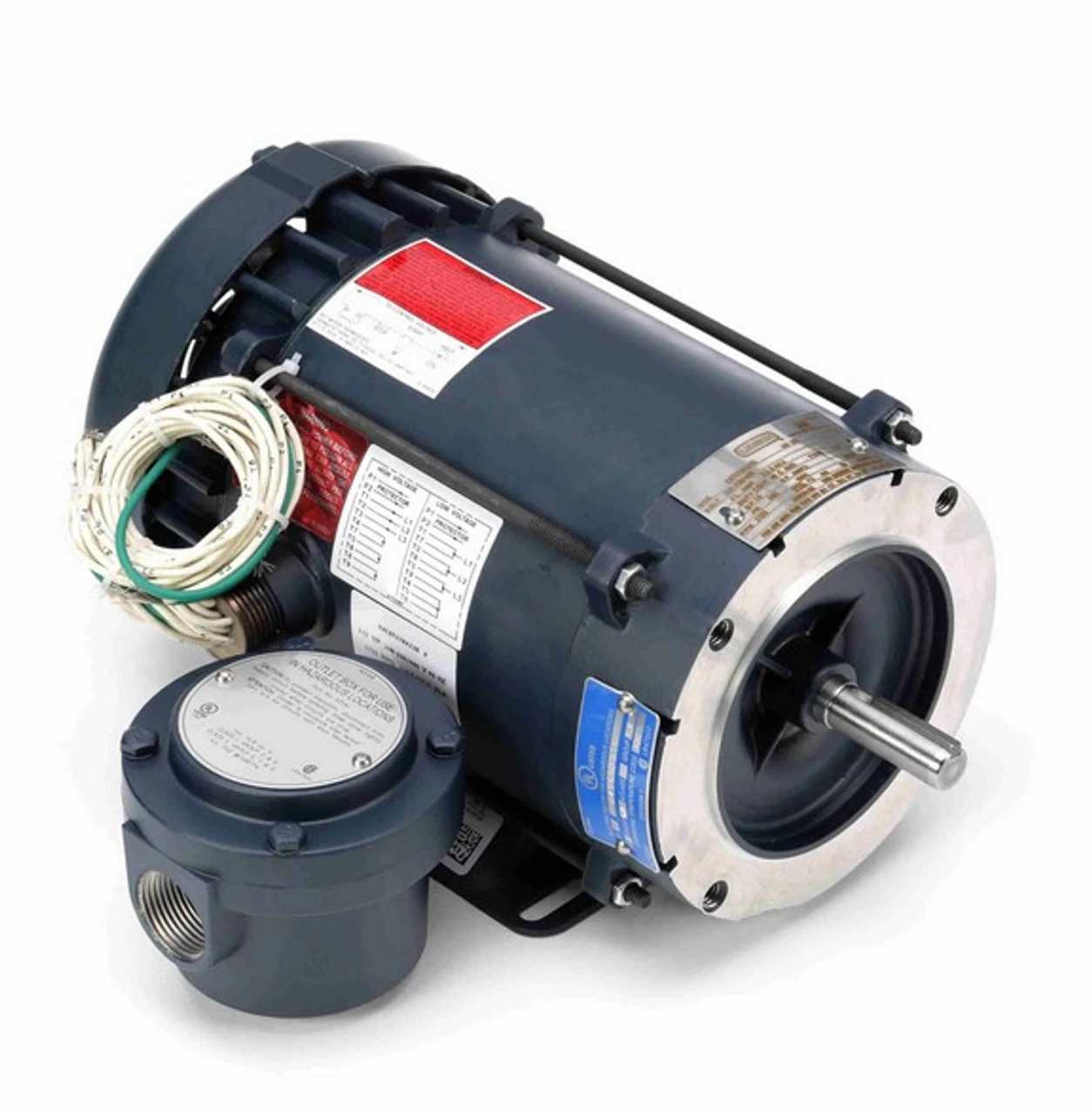 Explosion-Proof motor for use in hazardous environments with a C-face mount. DIV 1 EXP PROOF CL I GR CD CL II GR FG T3C. Bolt holes are 3 3/4″ on center measured across the shaft. Wiring diagram on motor name plate. TEFC = Totally Enclosed Fan-Cooled. 116190.00