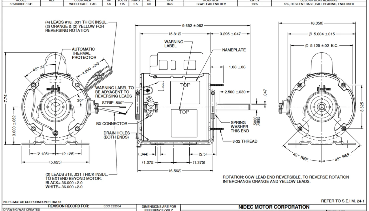 - 1/6 hp 1625 RPM (1 speed), 2.5 amps 230V Volts 60 Hz PSC Motor