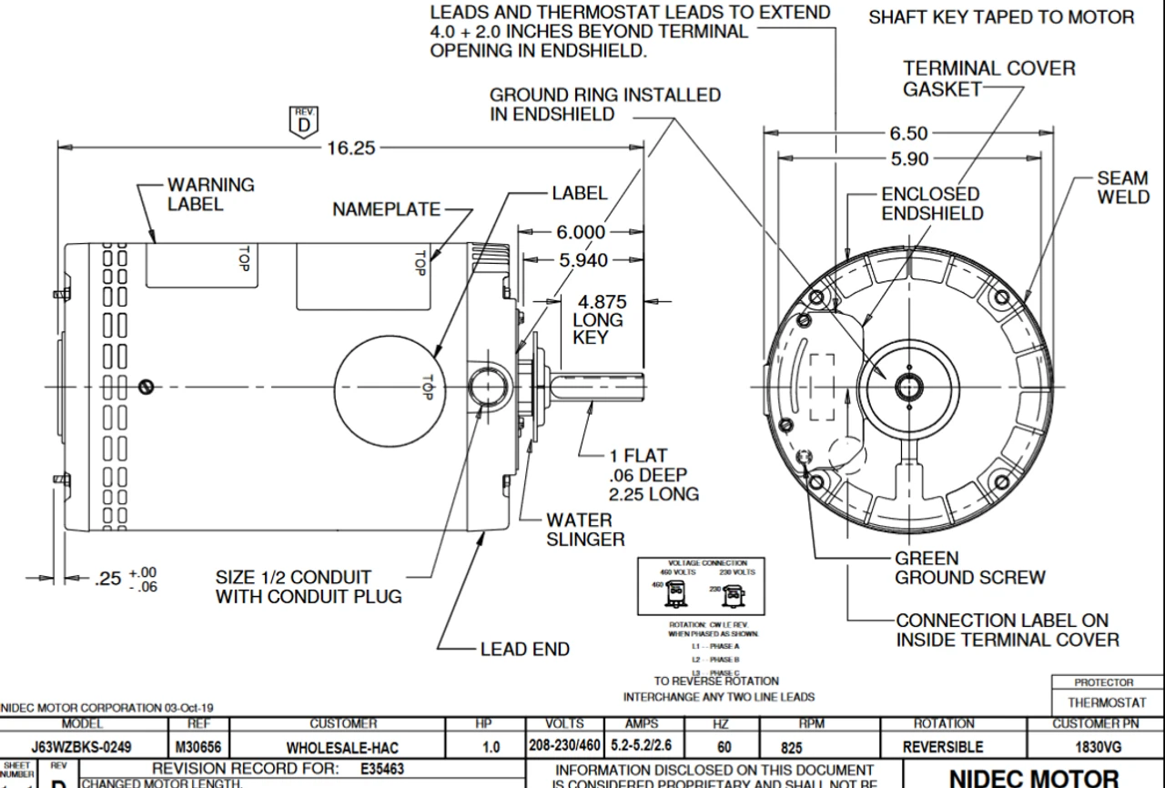 Commercial Condenser Fan Motor for applications using a variable frequency drive. Wiring diagram on motor name plate. OAO = Open Air-Over, J063BKS0249015B