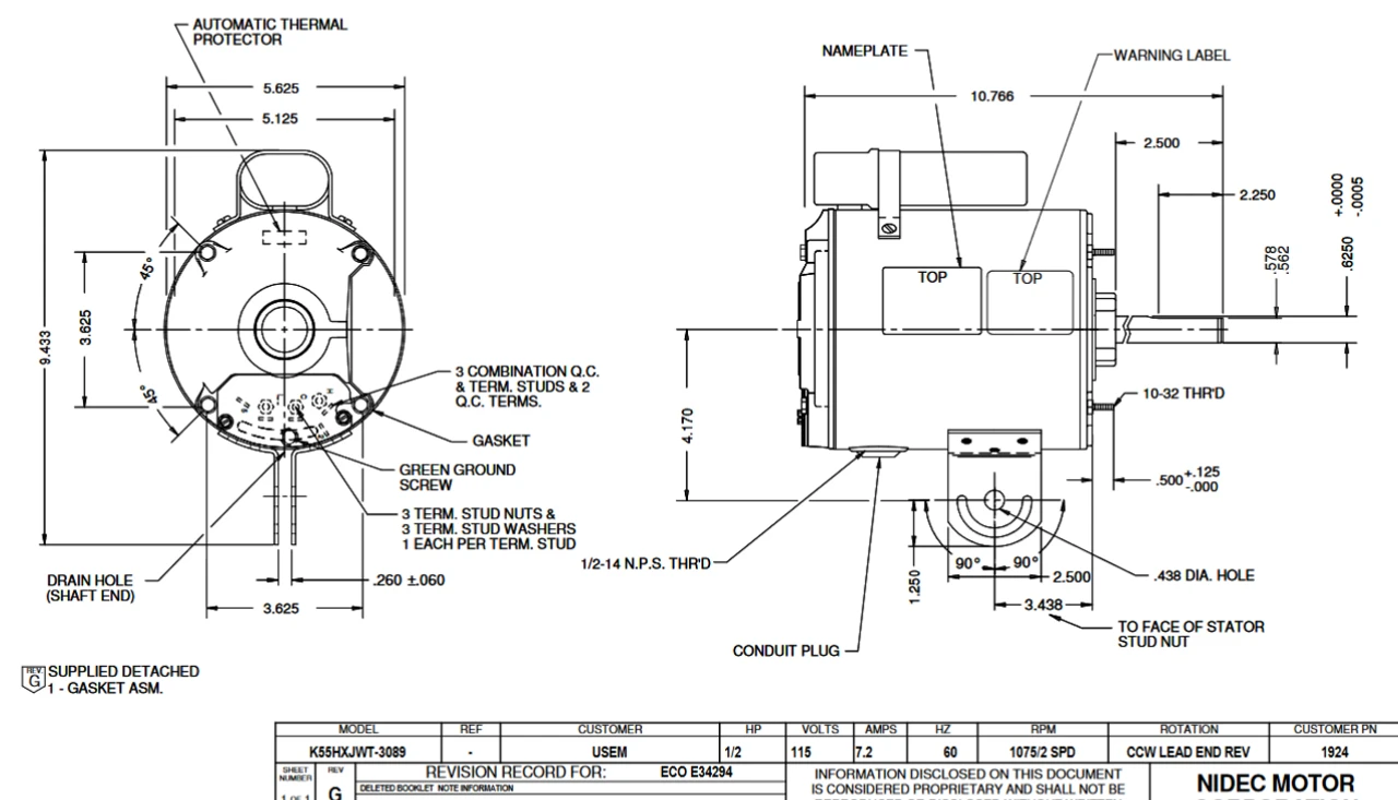 - 1/2 HP 1075 RPM (2 speed), 7.2 amps 115V Volts 60 Hz PSC Motor