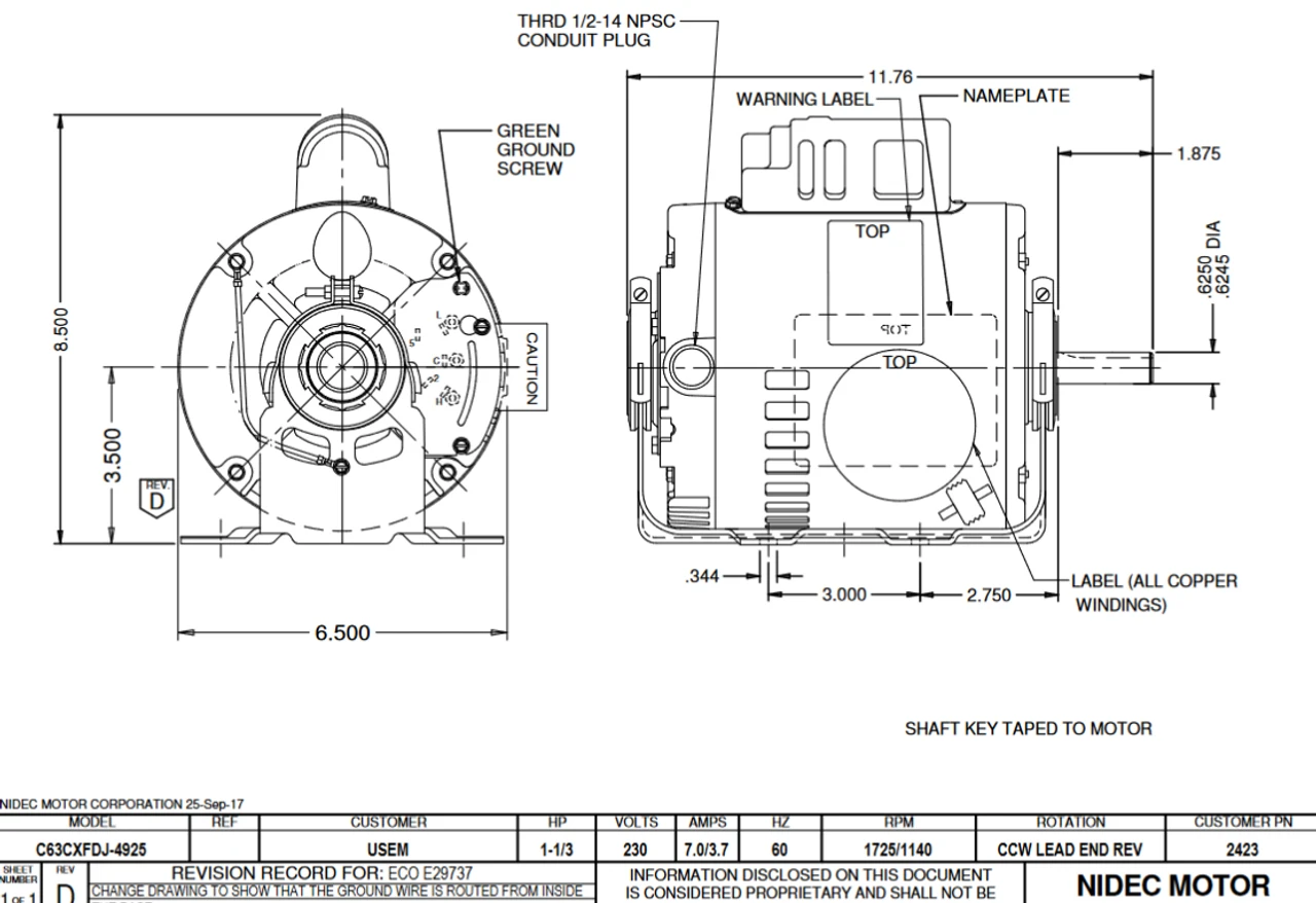Belt Drive Fan Motor for evaporative cooling units. Wiring diagram on motor name plate. ODP = Open Drip-Proof, C063FDJ4925012B