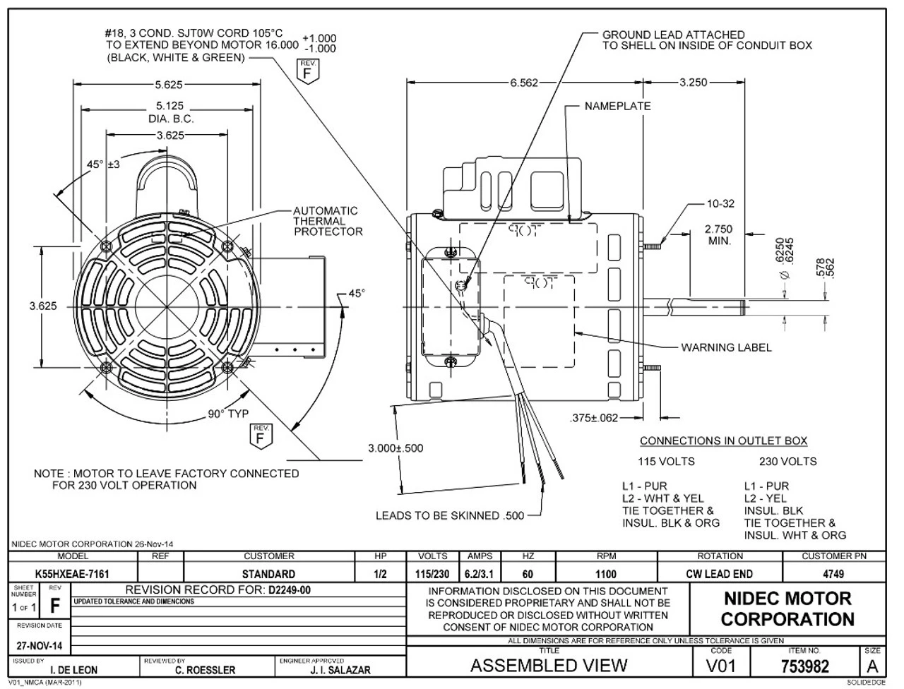 Permanent Split Capacitor Motor. Automatic Overload Protection. Continuous Duty; Open Enclosure; 40C Ambient Temperature; 16″ Leads, 60 Hertz. K055EAE7161023B.