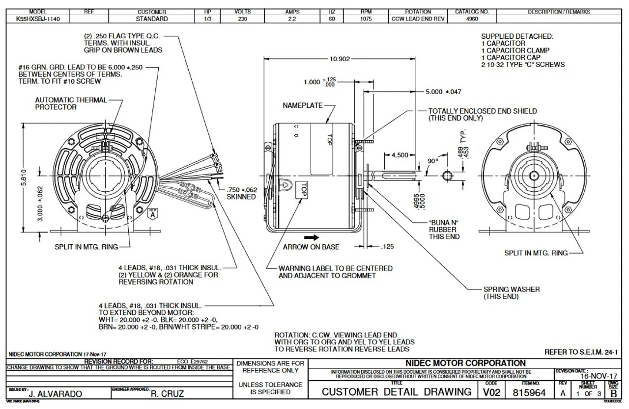 Permanent Split Capacitor Motor. Automatic Overload Protection. Continuous Duty; Open Drip-Proof Enclosure; Class B Insulation; 60C Ambient Temperature; 20″ Leads, K055SBJ1140802B