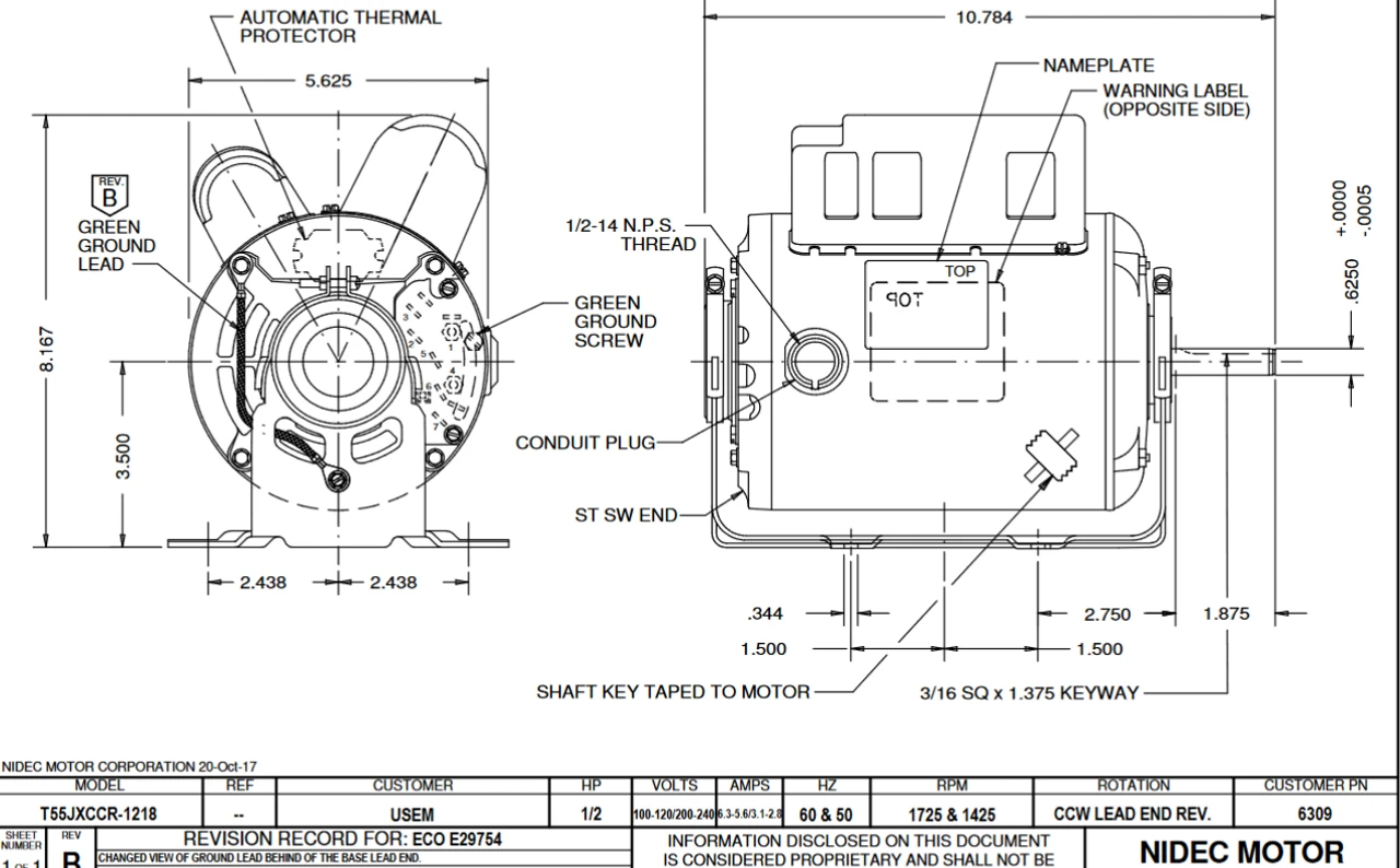 - Service Factor = 1.25, Overload Protection: Auto