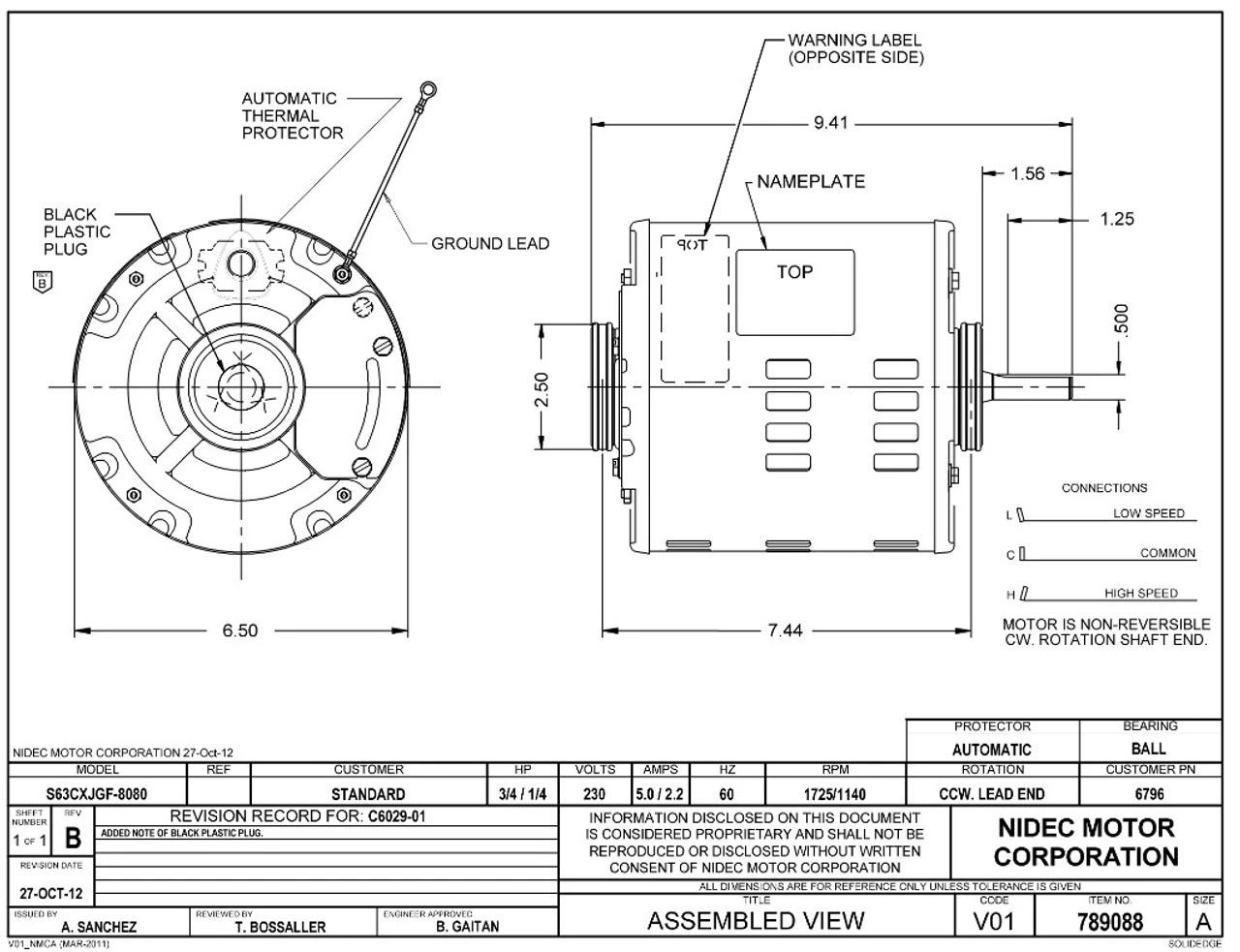 Split Phase Evaporative Cooler Motor. Automatic Overload Protection. Continuous Duty; Open Enclosure; Class F Insulation; 40C Ambient Temperature; 60 Hertz. S063JGF8080011B.