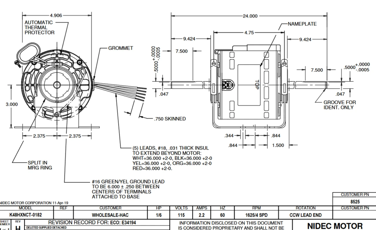 Direct Drive Fan Motor for central HVAC systems. Wiring diagram on motor name plate. Open, K048NCT0182011B