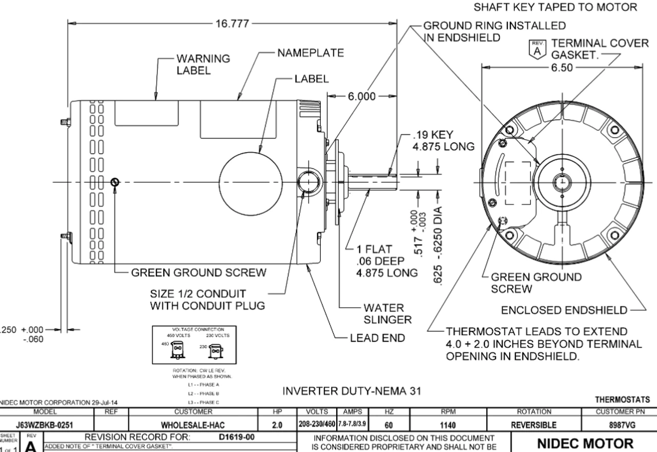 Commercial Condenser Fan Motor for applications using a variable frequency drive. Wiring diagram on motor name plate. OAO = Open Air-Over, J063BKB0251015B