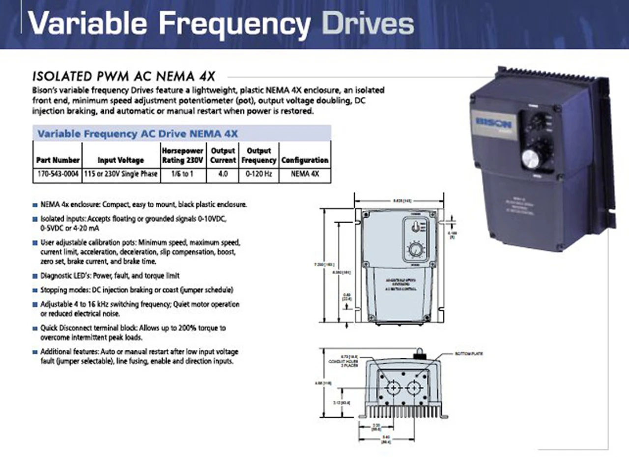 Bison’s variable frequency Drives feature a lightweight plastic NEMA 4X enclosure, an isolated front end, minimum speed adjustment potentiometer (pot), output voltage doubling, DC injection braking, and automatic or manual restart when power is restored.