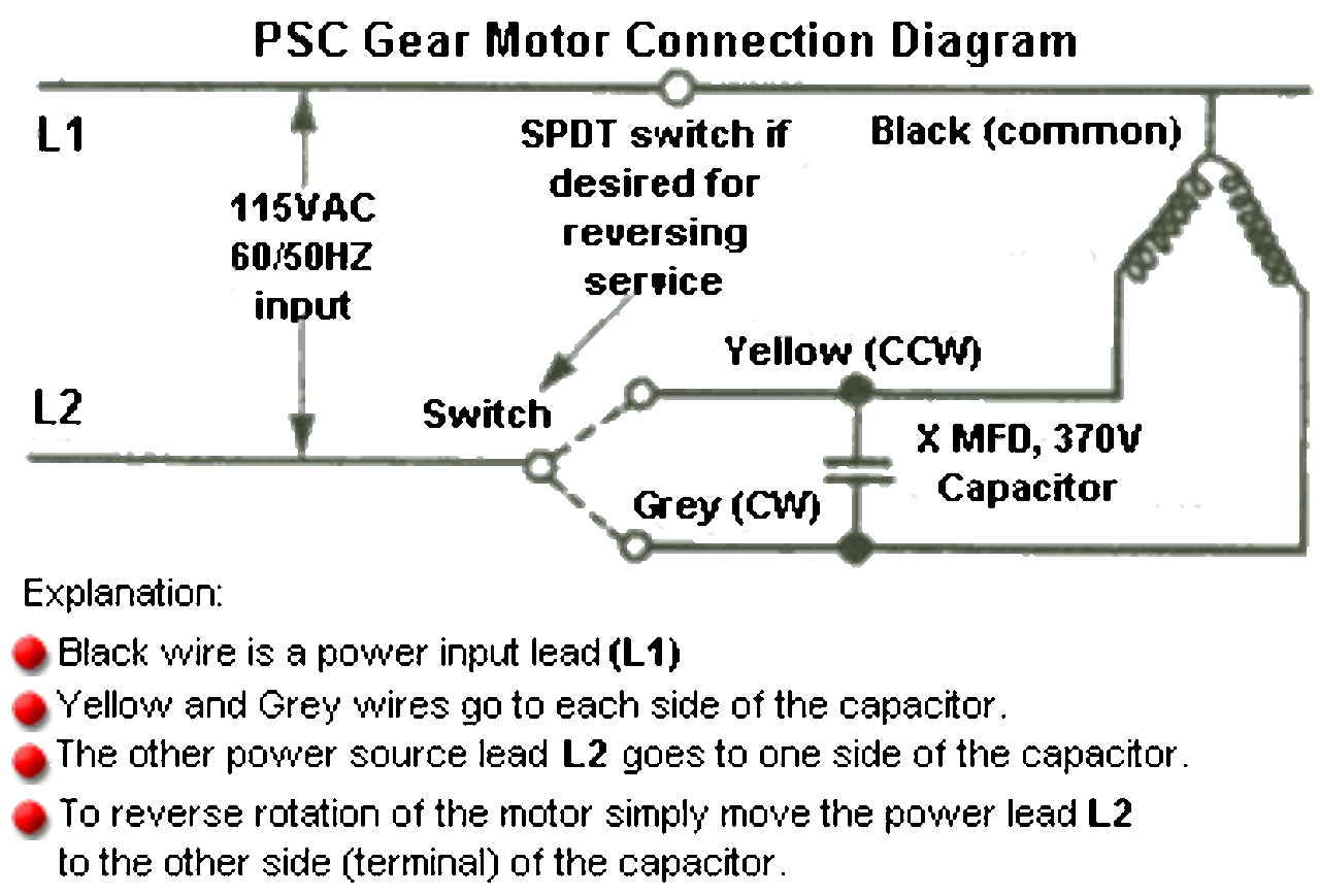 QGM-5018-2 Requires 4MFD 370 volt capacitor (included). Mounting = Output Shaft Horizontal Only. Thermal Protection = Auto