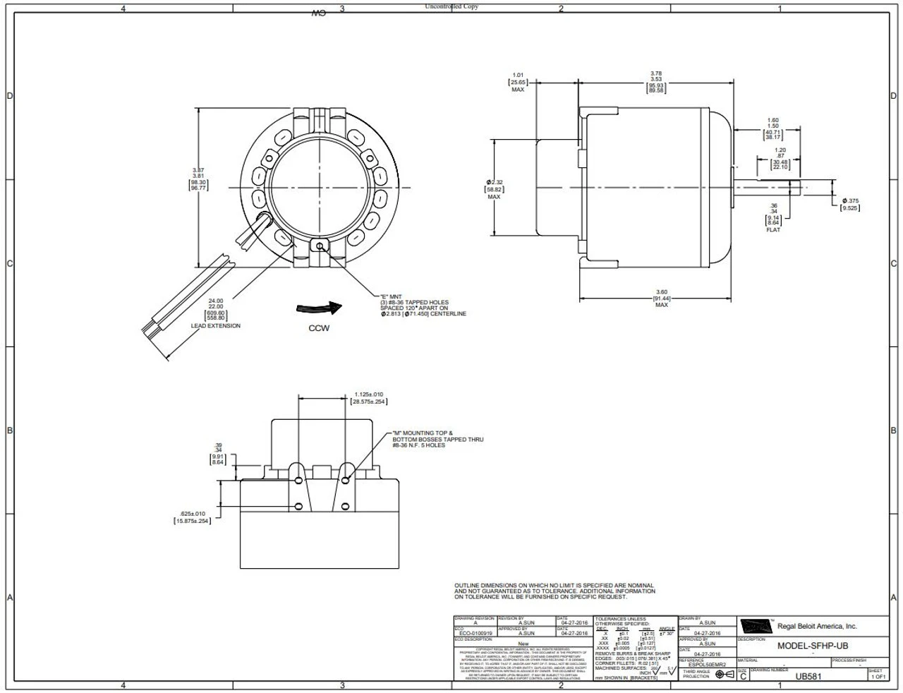 - Rotation: Counter Clockwise Lead End; Shaft: 3/8″ x 1-1/2″