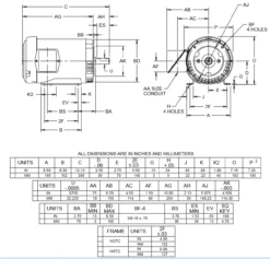 - Repositionable combination base – Holes and slots for NEMA 56, 56H, 143T and 145T mounting can be rotated for NEMA F-2 or F-3 conduit box locations (F-1 standard factory conduit box location)