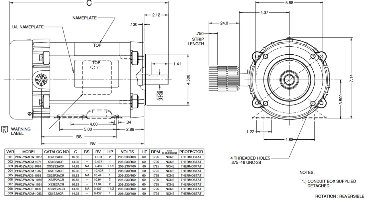 - C-Face Mount, Ball Bearings, Class F Insulation, Reversible